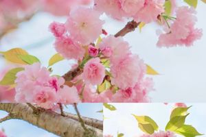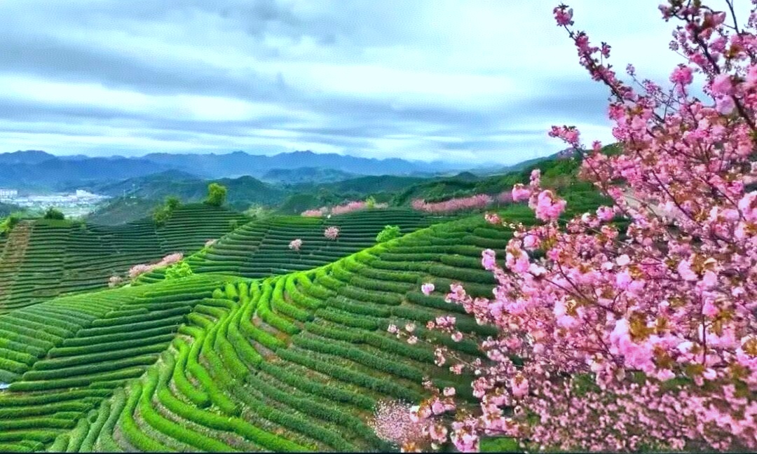 粉白色的晚樱在茶山间绚丽绽放一朵朵,一簇簇